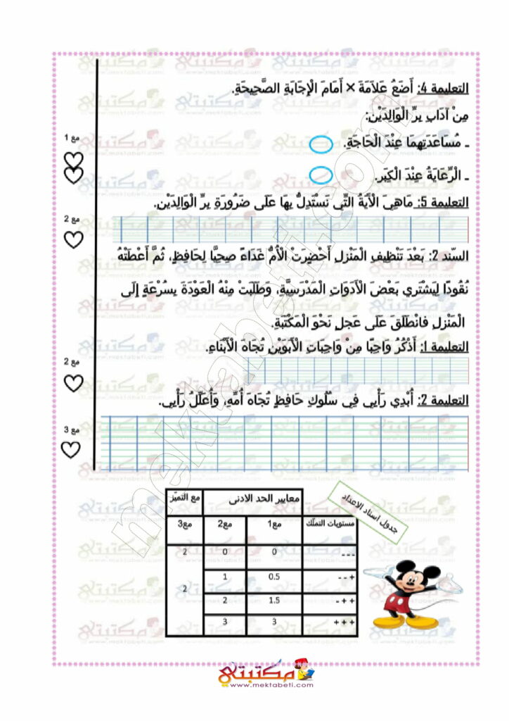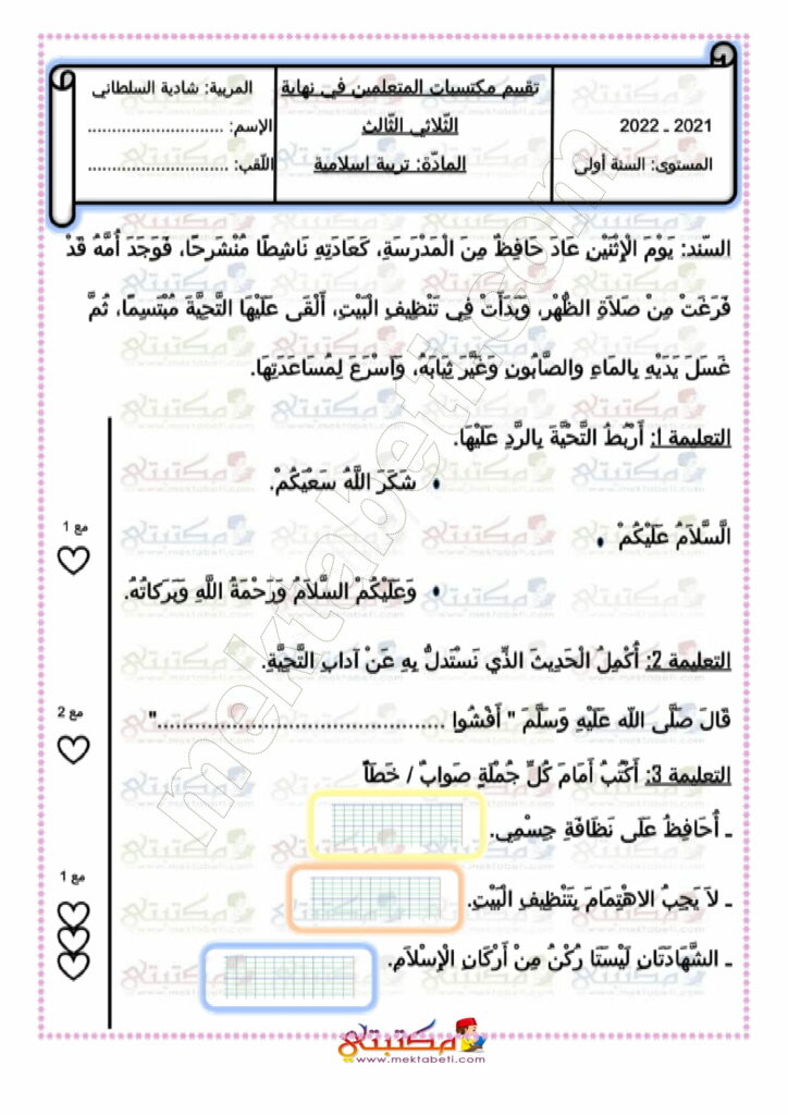 امتحان تربية إسلامية السنة الأولى الثلاثي الثالث