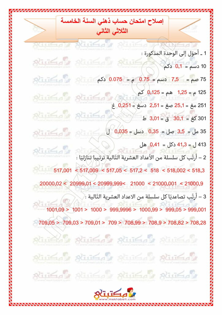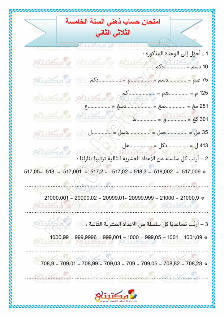 امتحان حساب ذهني السنة الخامسة الثلاثي الثاني