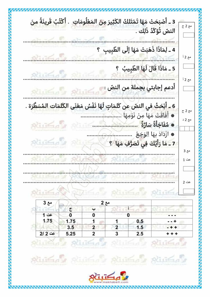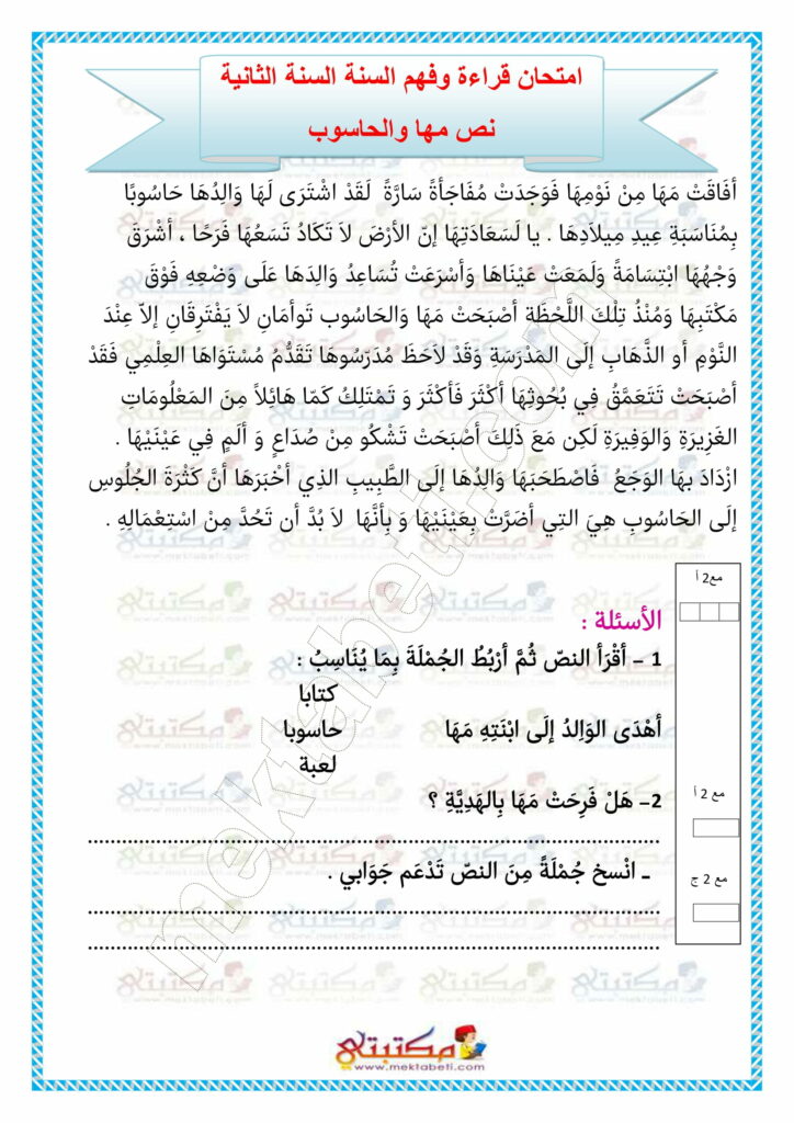 امتحان قراءة وفهم السنة الثانية نص مها والحاسوب