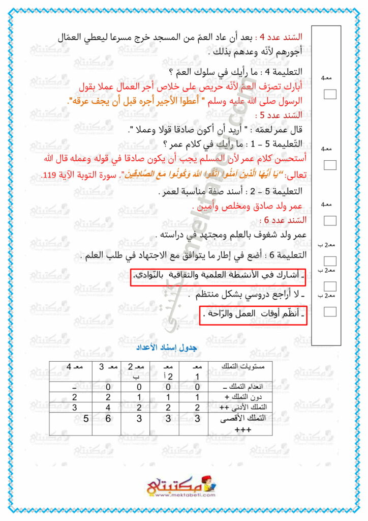 تقييم في مادة التربية الإسلامية السنة الثالثة الثلاثي الثاني