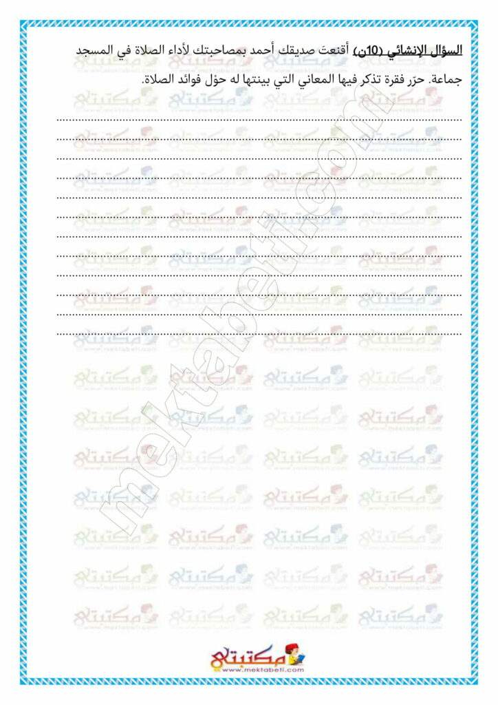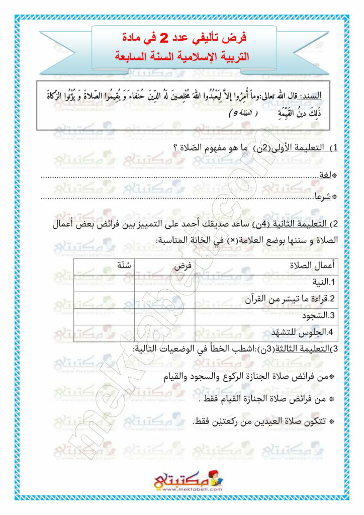 فرض تأليفي عدد 2 في مادة التربية الإسلامية السنة السابعة