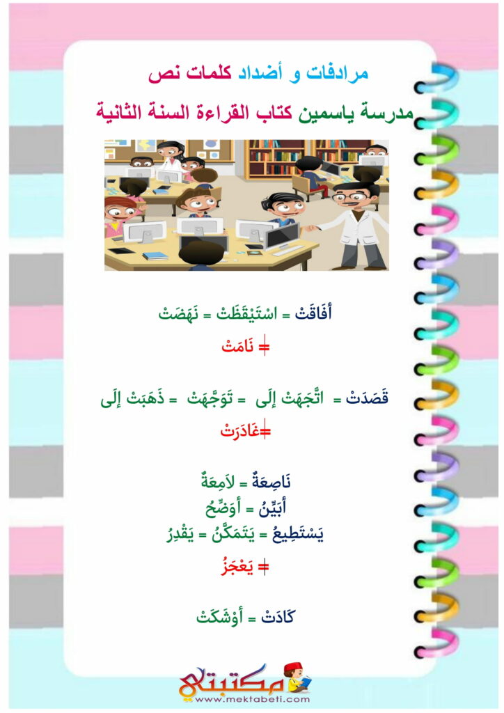 مرادفات و أضداد كلمات نص مدرسة ياسمين كتاب القراءة السنة الثانية