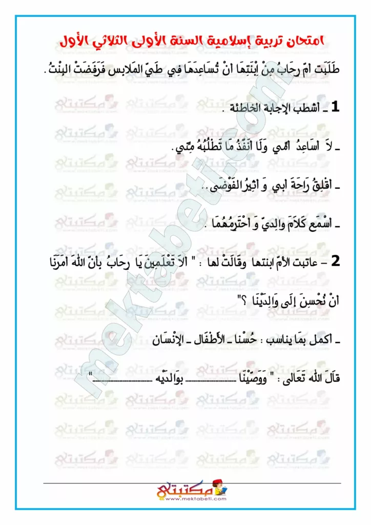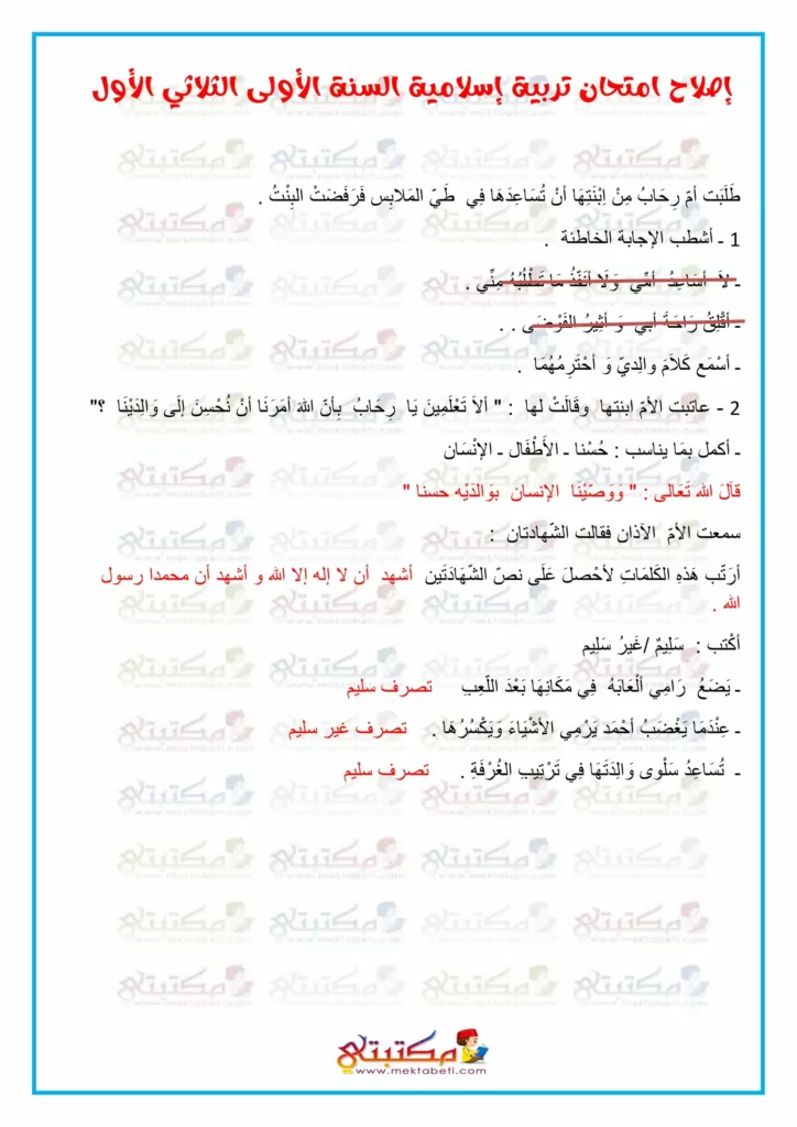 إمتحان تربية إسلامية السنة الأولى الثلاثي الأول مرفق بالإصلاح