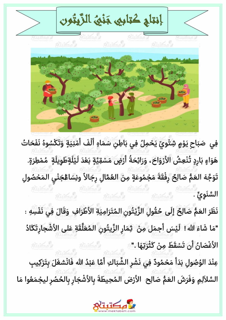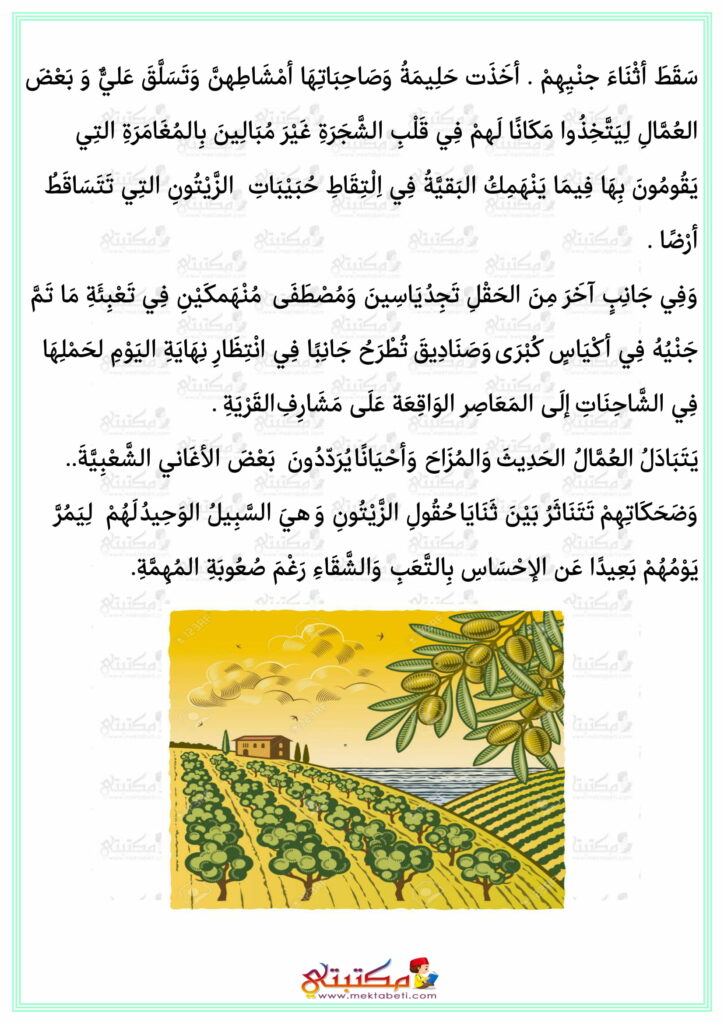 وَفِي جَانِبٍ آخَرَ مِنَ الحَقْلِ تَجِدُ يَاسِينَ وَمُصْطَفَى مُنْهَمكَيْنِ فِي تَعْبِئَةِ مَا تَمَّ جَنْيُهُ فِي أكْيَاسٍ كُبْرَى وَصَنَادِيقَ تُطْرَحُ جَانِبًا فِي انْتِظَارِ نِهَايَةِ اليَوْمِ لحَمْلِهَا فِي الشَّاحِنَاتِ إلَى المَعَاصِر الوَاقِعَة عَلَى مَشَارِفِ القَرْيَةِ