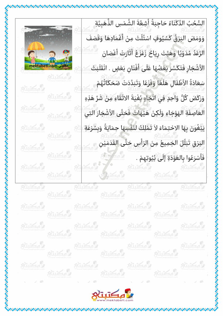 فِي يَوْمٍ رَبِيعِيّ مُشْمِسٍ أرْسَلَت غَزَالَةُ الكَوْنِ أشِعّةً سنيّة أيْقَظَتْ الطَّبِيعَةَ النّائِمَةَ وَ أدْخَلَتْ فِي أفْئِدَةِ النَّاسِ بَهْجَةً عَارِمَةً بِقُدُومِ فَصْلِ الرَّبِيعِ الحَالِمِ البَدِيعِ وَبَدَتْ المُنْتَزَهَاتُ كَجَنَّاتِ عَدْنٍ مَسَّتْهَا يَدُ سَاحِرٍ عَبْقَرِيّ فَتَرَكَتْ مُتْعَةً للسَّمْعِ وَالقَلْبِ وَالبَصَرِ . فِي هَذَا الجَوِّ اللّطِيفِ قَرَّرَ الأطْفَالُ اللّعِبَ فِي حَدِيقَةِ الحَيِّ فَهذَا شُكْرِي يَلْعَبُ بِالكُرَةِ ، وَذاَكَ رَبِيعٌ يَقْفِزُ عَلَى الحَبْلِ …كَانَتْ عَلَى وُجُوهِهِمْ بَسْمَةُ التَّفَاؤُلِ وَالأمَلِ وَارْتَفَعَتْ قَهْقَهَاتِهِمْ تَمْلَأ المَكَانَ وَانْتَشَرَتْ السَّعَادَةُ فِي كُلِّ رُكْنٍ .