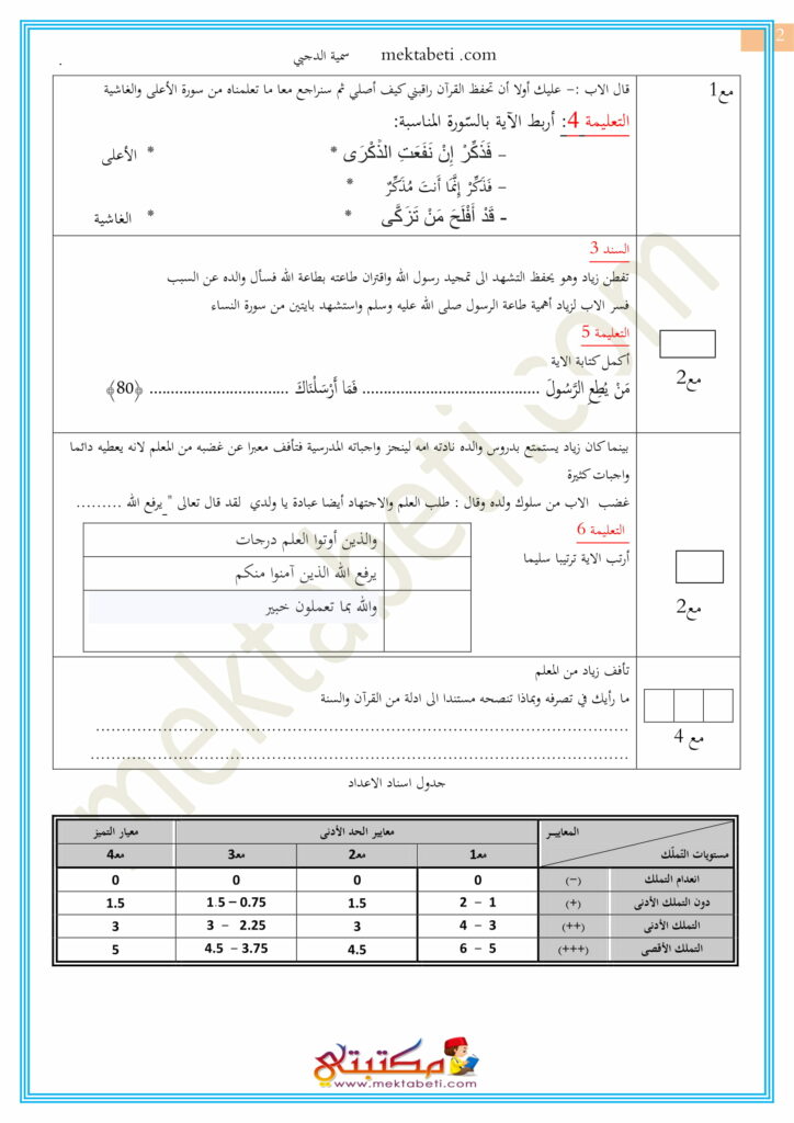 اختبار التربية الإسلامية السنة الرابعة الثلاثي الثاني