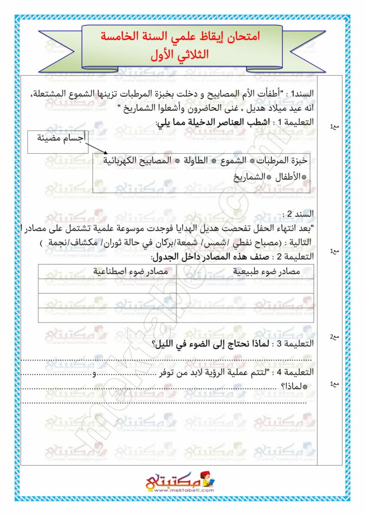 امتحان إيقاظ علمي السنة الخامسة الثلاثي الأول