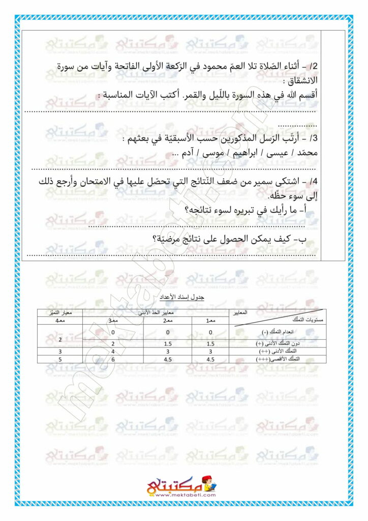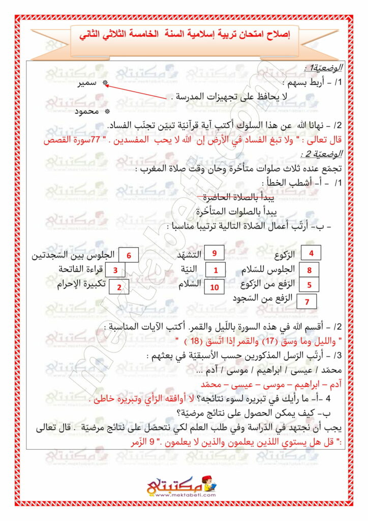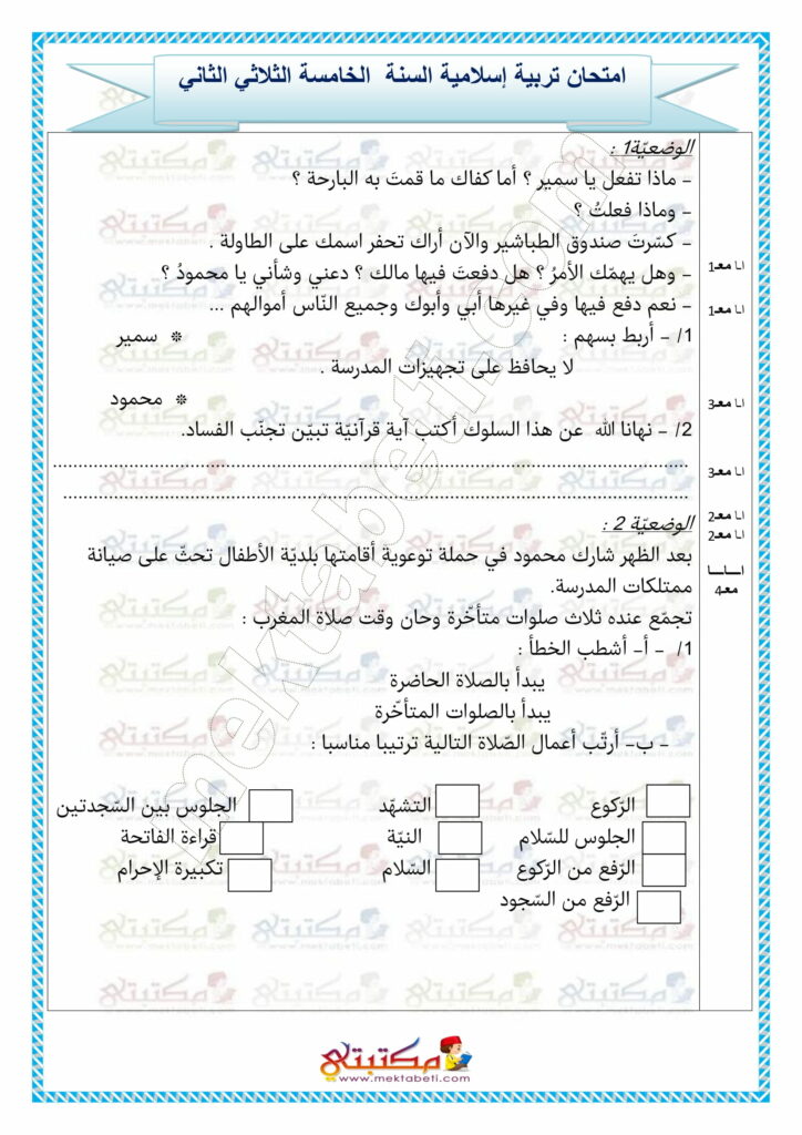 امتحان تربية إسلامية السنة الخامسة الثلاثي الثاني مع الإصلاح