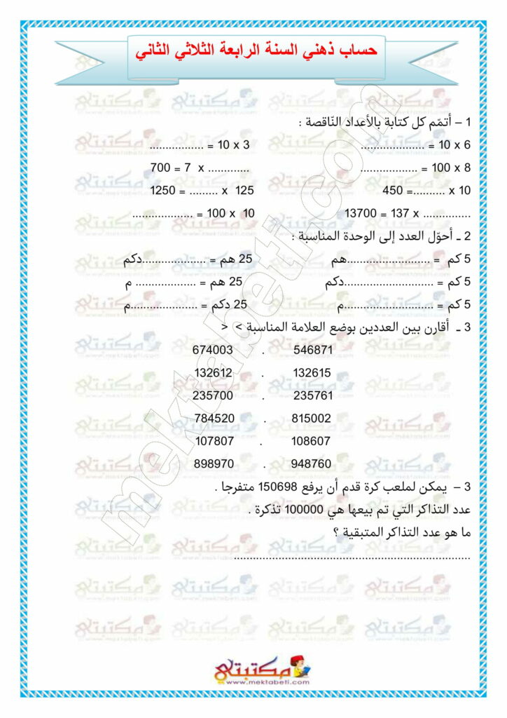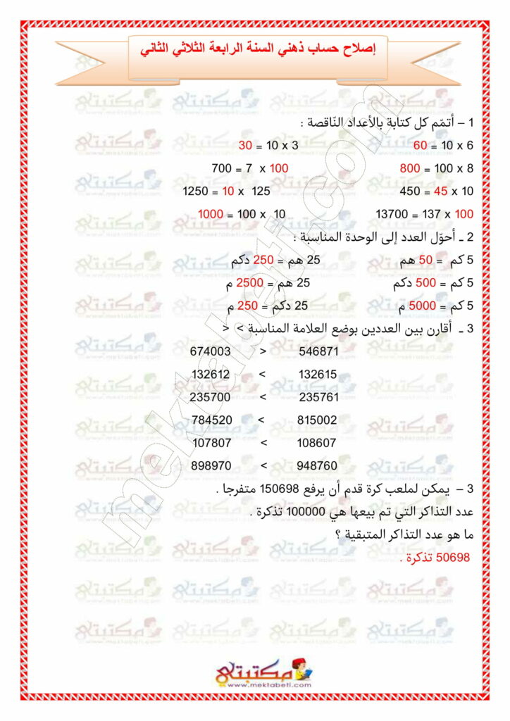 امتحان حساب ذهني السنة الرابعة الثلاثي الثاني مع الإصلاح