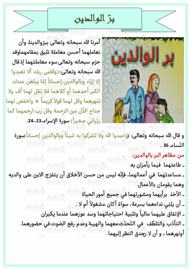 ـ مساعدتهما  في أعمالهما، فإنّه ليس من حسن الأخلاق أن يتفرّج الابن على والديه وهما يقومان بالأعمال.