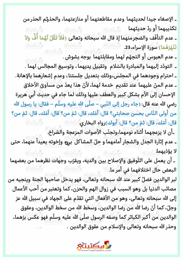 ـ عدم إثارة الجدل والشجار أمامهما  و حلّ المشاكل  بينه وإخوته بعيداً عنهما، حتى لا يؤذيهما. ـ أن يعمل على التّوفيق والإصلاح بين والديه، ويقرّب وجهات نظرهما من بعضهما البعض حال اختلافهما في أمر ما.