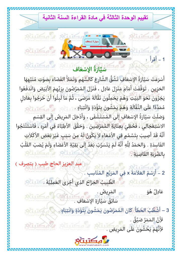 تقييم الوحدة الثالثة في مادة القراءة السنة الثانية
