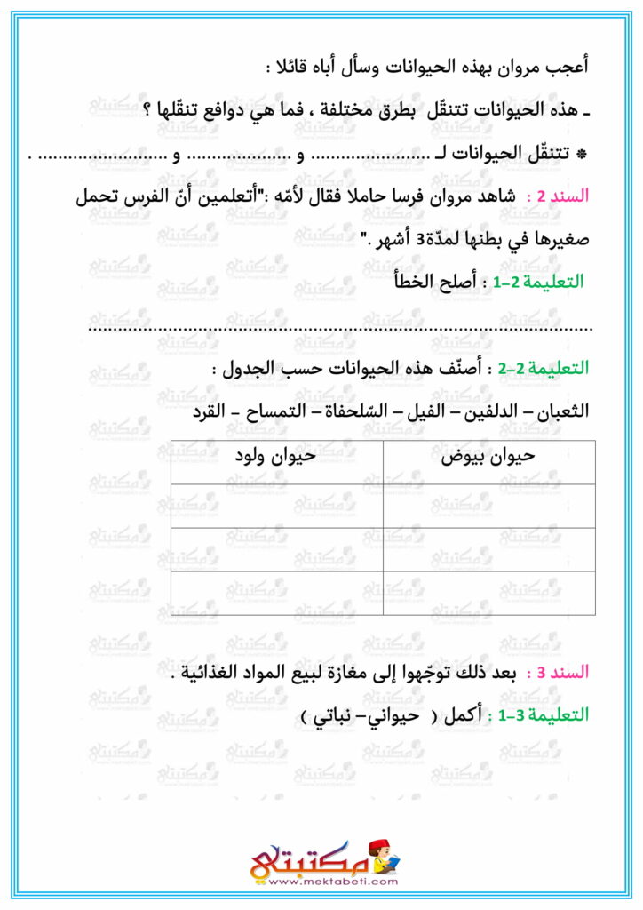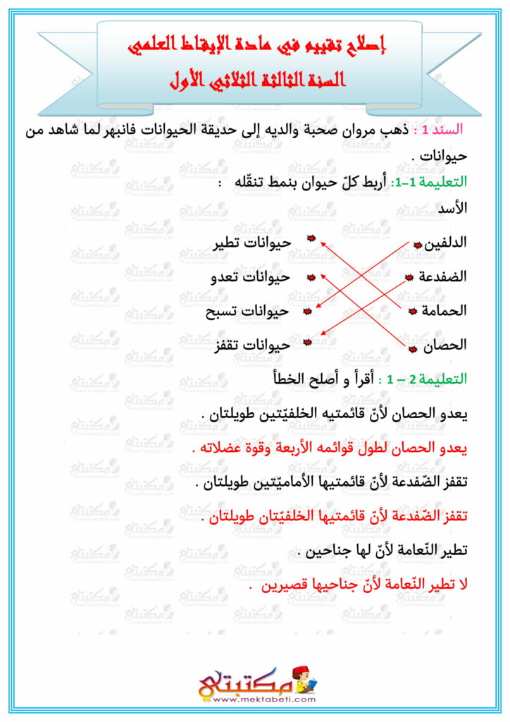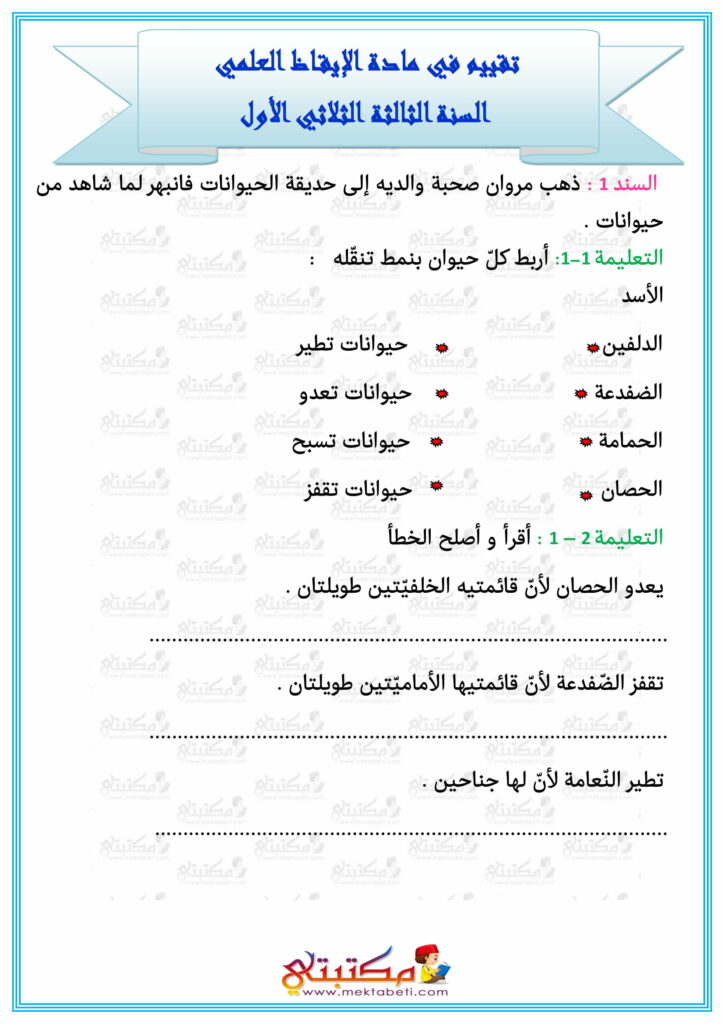 تقييم في مادة الإيقاظ العلمي السنة الثالثة الثلاثي الأول مع الإصلاح