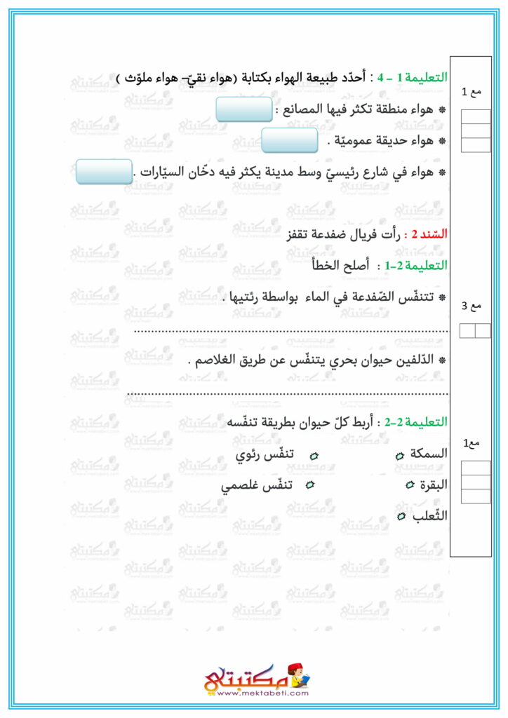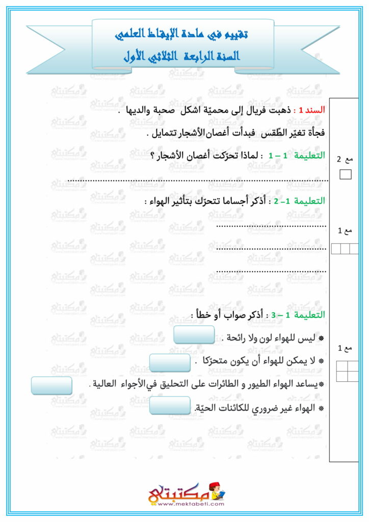 تقييم في مادة الإيقاظ العلمي السنة الرابعة الثلاثي الأول