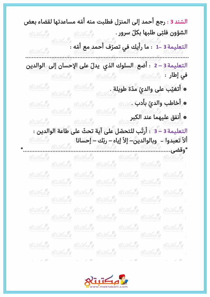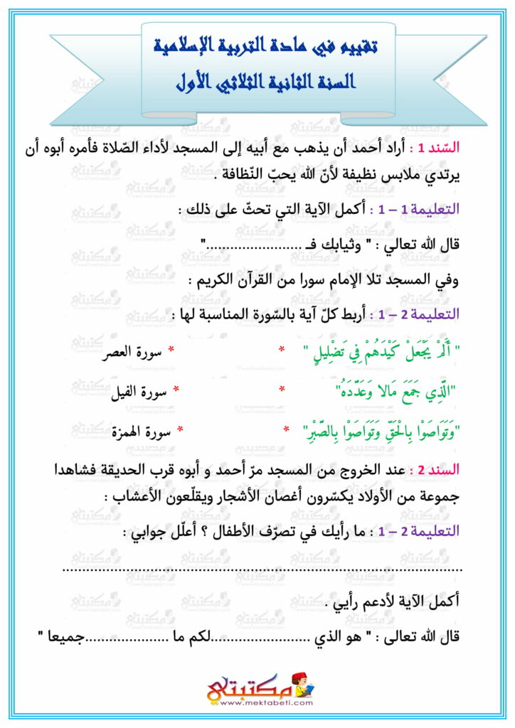 تقييم في مادة التربية الإسلامية السنة الثانية الثلاثي الأول