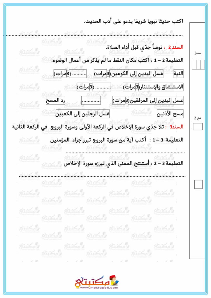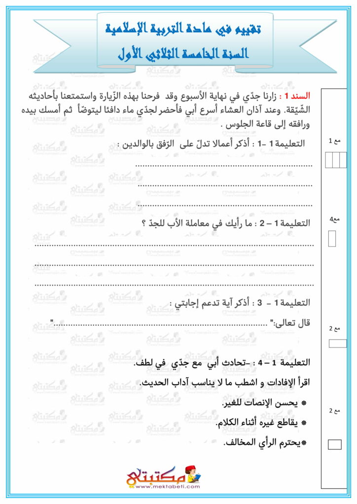 تقييم في مادة التربية الإسلامية السنة الخامسة الثلاثي الأول