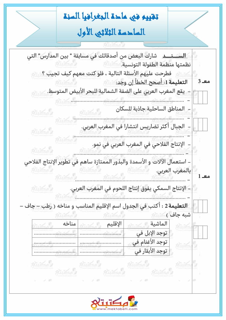 - أساسي / الثلاثي الأول / امتحانات / امتحانات / سادسة إبتدائي / مواد اجتماعية