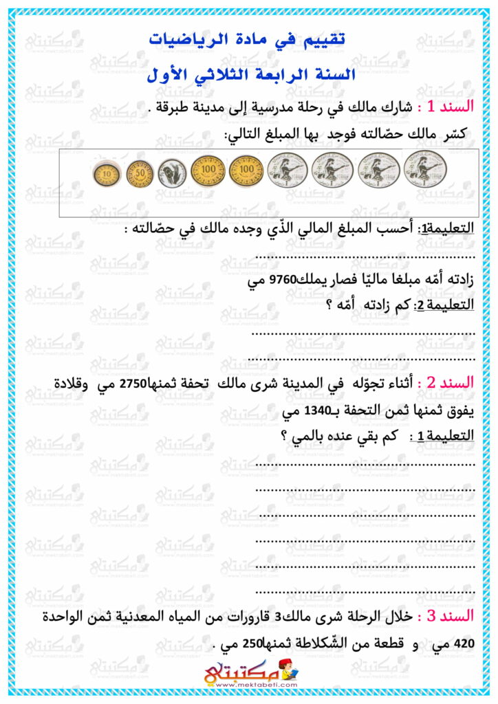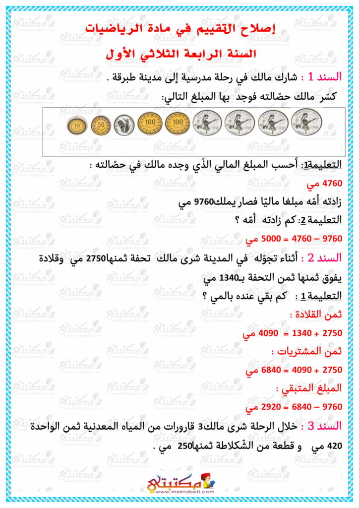 تقييم في مادة الرياضيات السنة الرابعة الثلاثي الأول مع الإصلاح