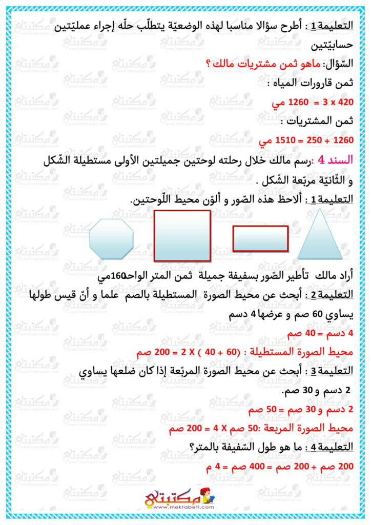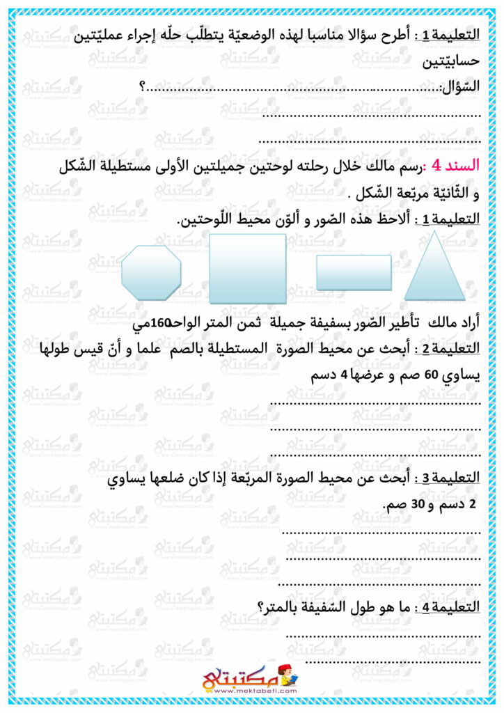 يشمل التقييم وضعيات ومسائل رياضية مثل عمليات الجمع وعمليات الطرح وعمليات الضرب وحساب المبالغ النقدية وقيس محيط المربع والمستطيل وتحويل الدسم والصنتمنر والمتر وغيرها من الوضعيات كما يرافق التقييم الإصلاح