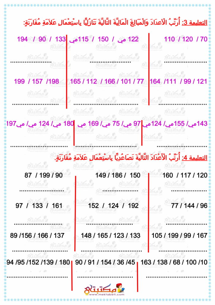رياضيات السنة الثانية الأعداد من 0 إلى 199 مقارنة وترتيبا