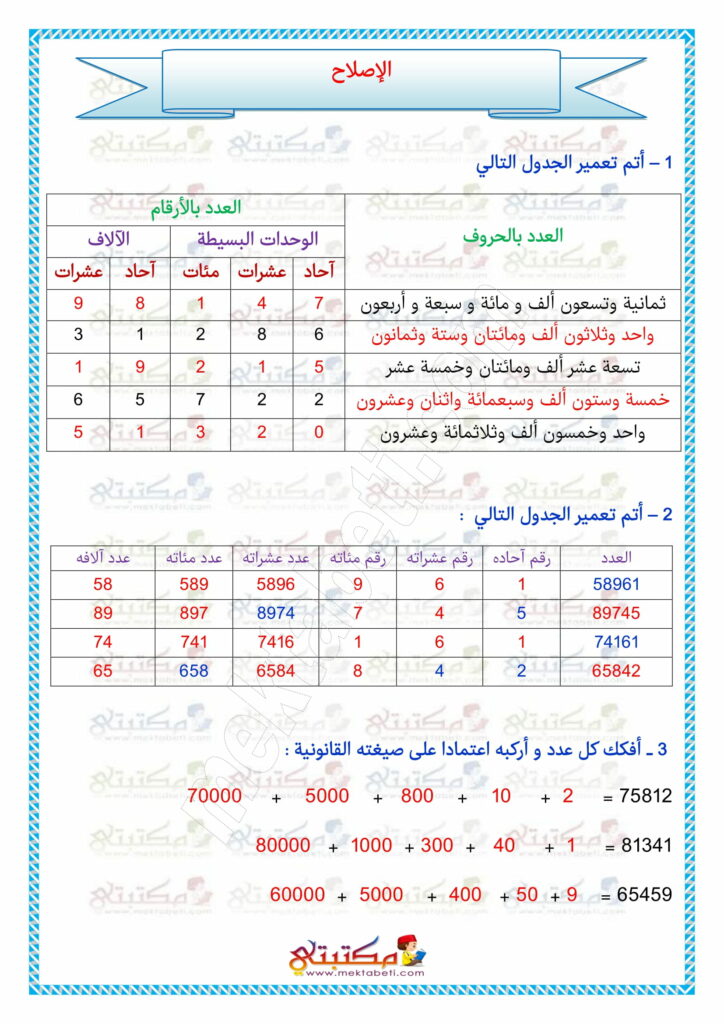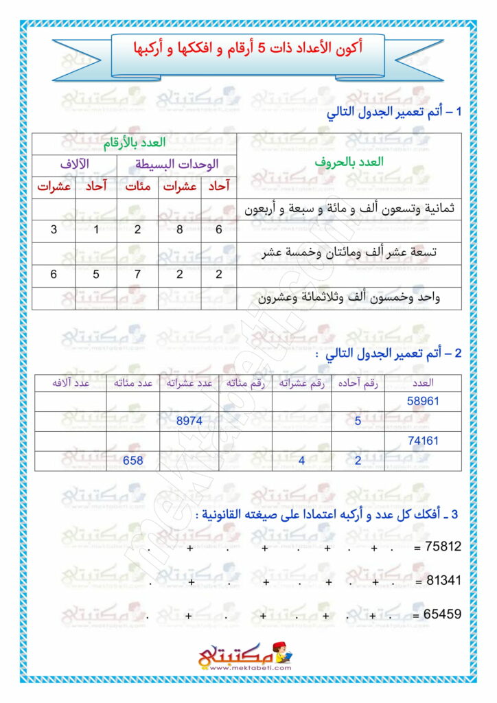 رياضيات السنة الرابعة أكون الأعداد ذات 5 أرقام و افككها و أركبها