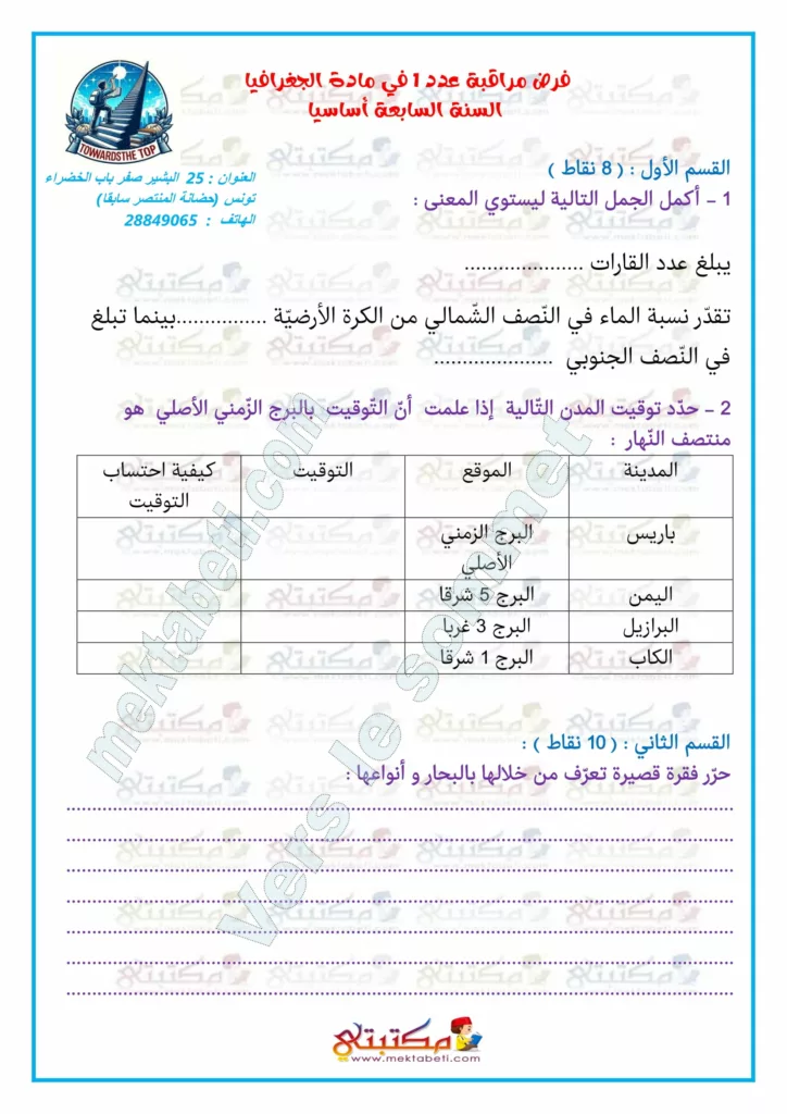 فرض مراقبة عدد 1 في مادة الجغرافيا السنة السابعة أنموذج 2