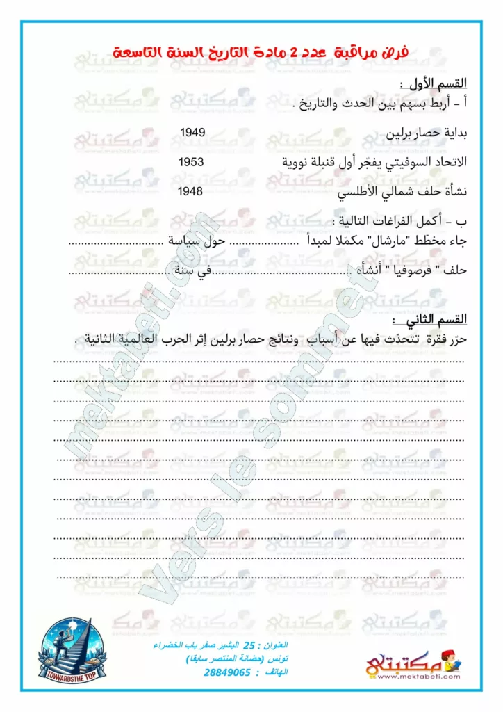 فرض مراقبة عدد 2 مادة التاريخ السنة التاسعة