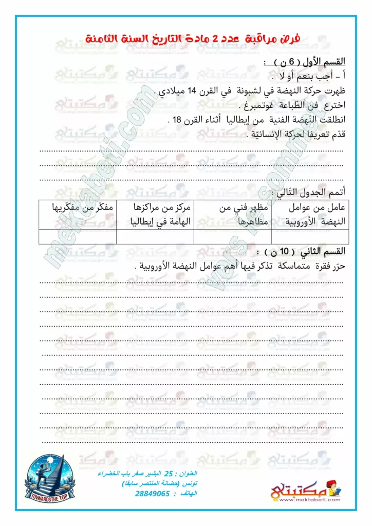 فرض مراقبة عدد 2 مادة التاريخ السنة الثامنة