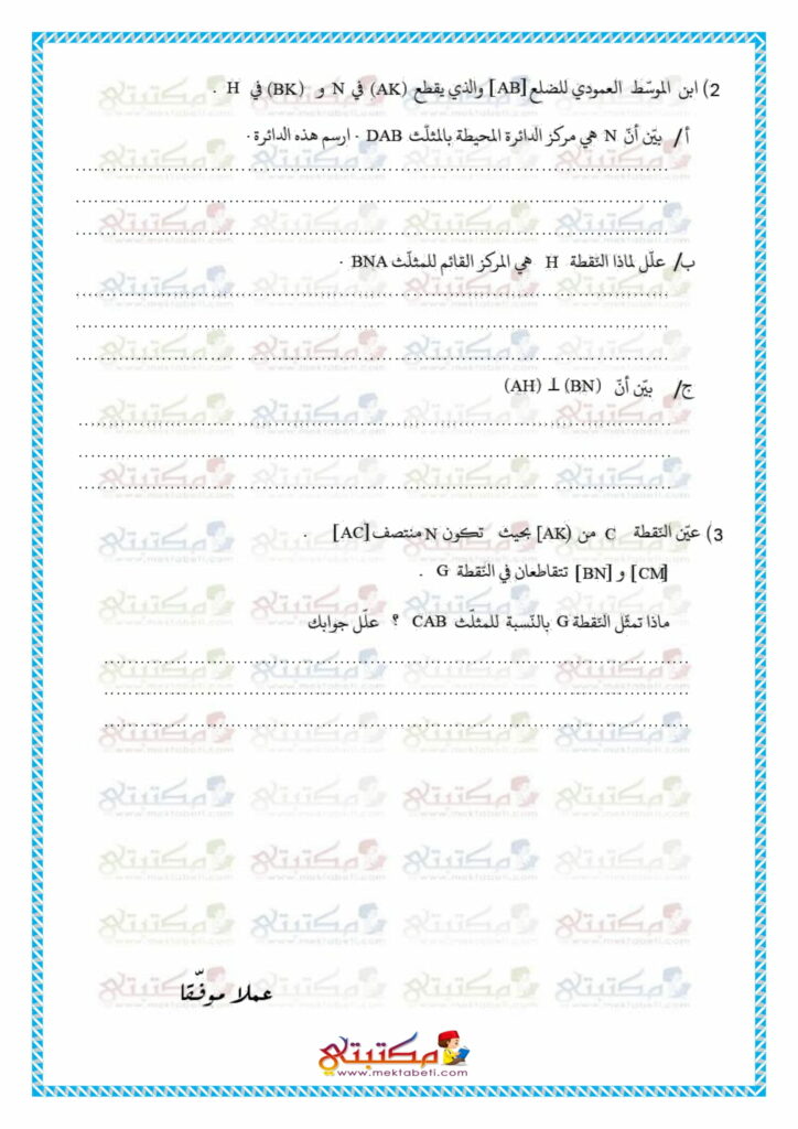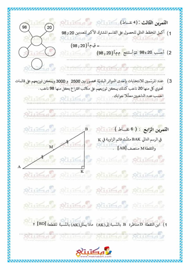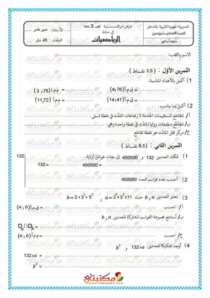 فرض مراقبة عدد 3 في الرياضيات السنة السابعة الثلاثي الثاني