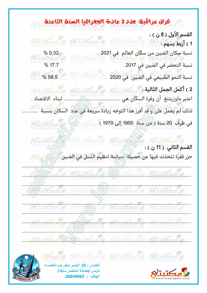 فرض مراقبة عدد 3 مادة الجغرافيا السنة الثامنة