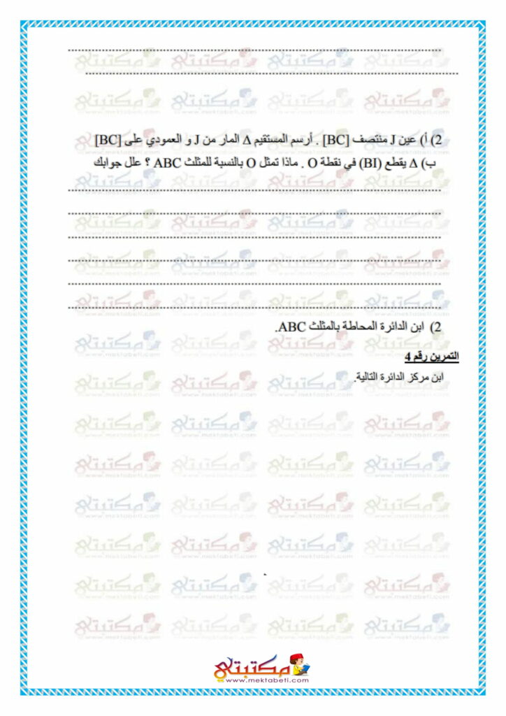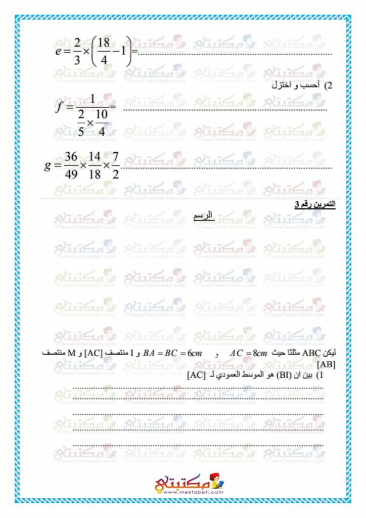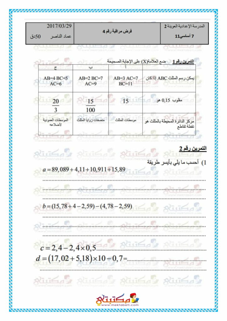 فرض مراقبة عدد 4 في مادة الرياضيات السنة السابعة الثلاثي الثاني