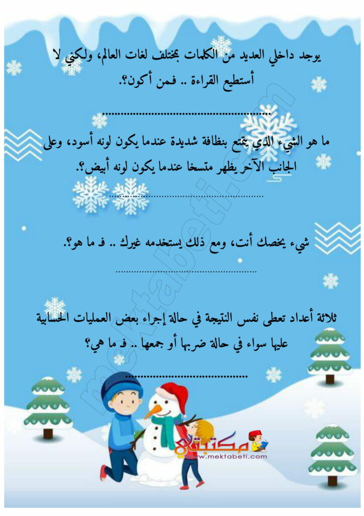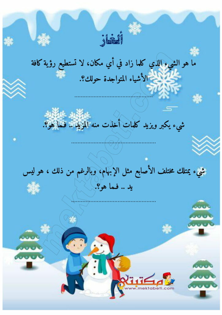 حل الألغاز : الظلام – الحفرة – القفاز-الكتاب – السبورة – الاسم -1 و 2 و 3