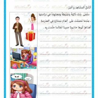 إنتاج كتابي حول الحاسوب سَلْمَى  بِنْتٌ ذَكِيّةٌ وَنَشِيطَةٌ وَمُجْتَهِدَةٌ فِي دِرَاسَتِهَا ، عِنْدَمَا تَحَصَّلَتْ عَلَى  أعْدَادٍ مُمْتَازَةٍ فِي المَدْرَسَةِ أهْدَاهَا أبُوهَا حَاسُوبًا جَدِيدًا لَطَالَمَا حَلُمَتْ بِهِ . فَرِحَتْ سَلْمَى فَرَحًا شَدِيدًا وَبَدَأتْ  تَسْتَخْدِمُ الحَاسُوبَ...