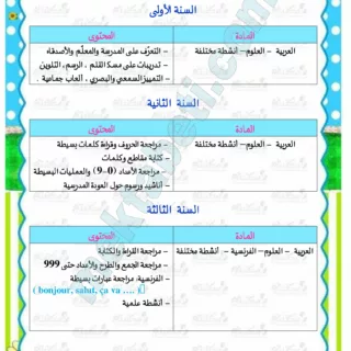 برنامج الوحدات التمهيدية في المرحلة الابتدائية السنة الأولى – التعرّف على المدرسة والمعلّم والأصدقاء – تدريبات على مسك القلم ، الرسم، التلوين – التمييز السمعي والبصري ، ألعاب جماعية  . السنة  الثانية – مراجعة الحروف...