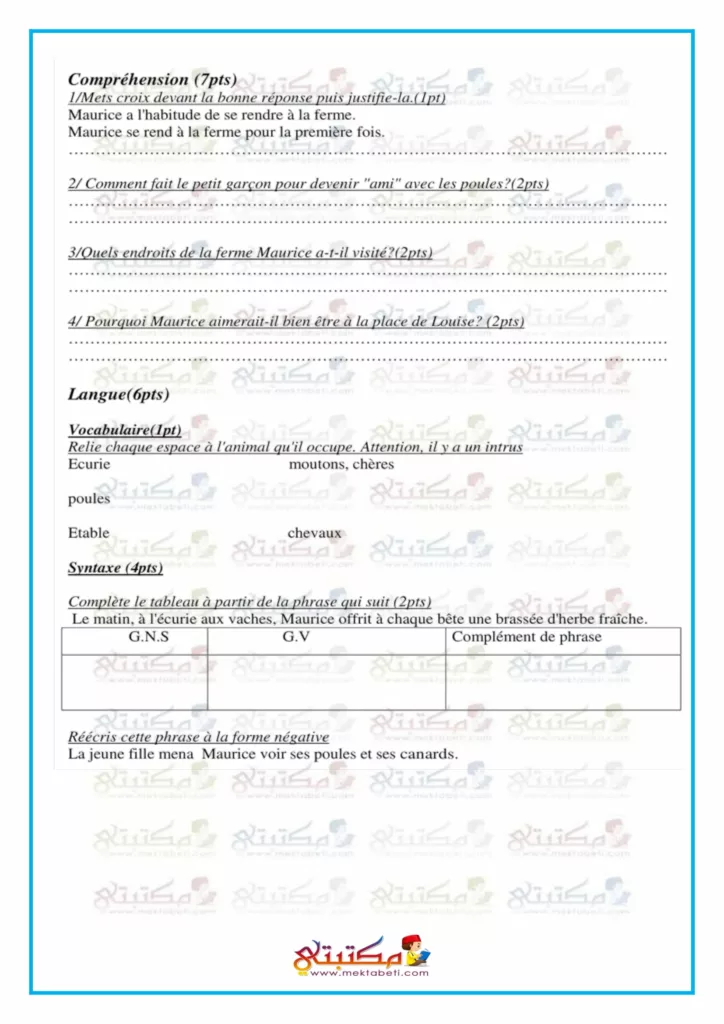 امتحان قراءة وفهم السنة الرابعة الثلاثي الأول مرفق بالإصلاح