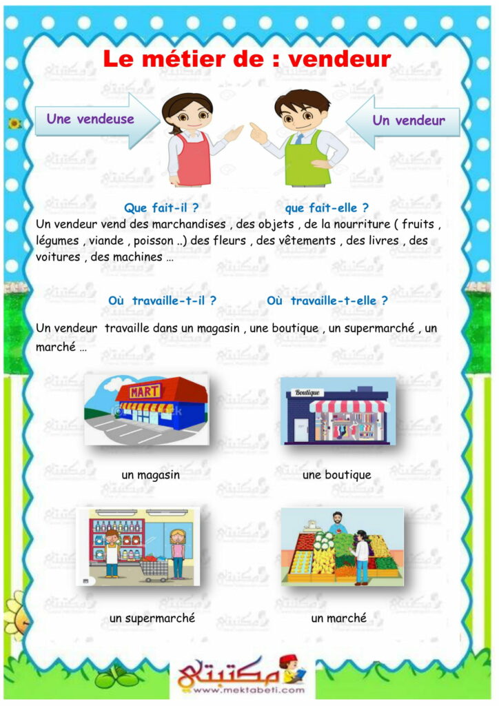 Un vendeur vend des marchandises , des objets , de la nourriture ( fruits , légumes , viande , poisson ..) des fleurs , des vêtements , des livres , des voitures , des machines …