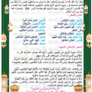 سورة البروج أسباب النزول تفسير تمارين أسْبَابُ النّزُولِ  : قَابَلَ كُفّارُ قُرَيْش دَعْوَةَ نَبِيّهِمْ مُحَمّدا ﷺ   بِالصَدّ وَالإيذَاءِ ، وَ بِشَتّى أنْوَاعٍ مِنَ العَذَابِ. لِذَلِكَ أرَادَ اللهُ ﷻ أنْ يُوَاسِيَهُ وَيُخَفّفَ عَنْهُ مَا يَشْعر...