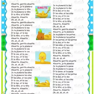 Chanson Alouette Je te plumerai le dosJe te plumerai le dosEt le dos, et le dosEt les ailes, et les ailesEt le cou, et le couEt le bec, et le becEt la tête, et...
