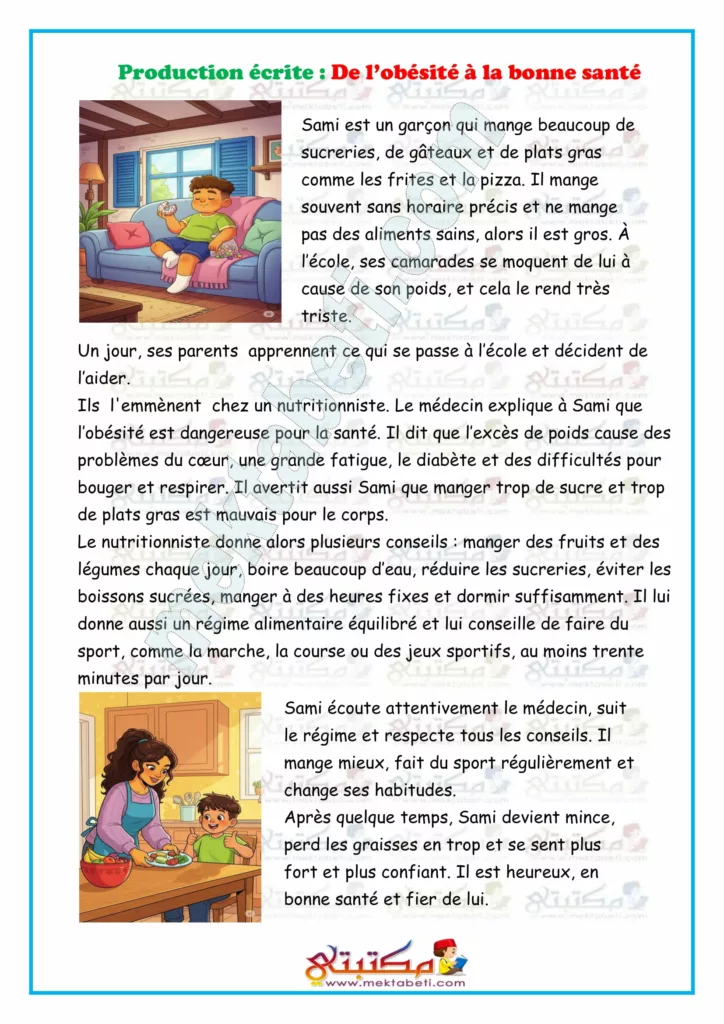 Sami est un garçon qui mange beaucoup de sucreries, de gâteaux et de plats gras comme les frites et la pizza. Il mange souvent sans horaire précis et ne mange pas des aliments sains, alors il est gros. À l’école, ses camarades se moquent de lui à cause de son poids, et cela le rend très triste.
