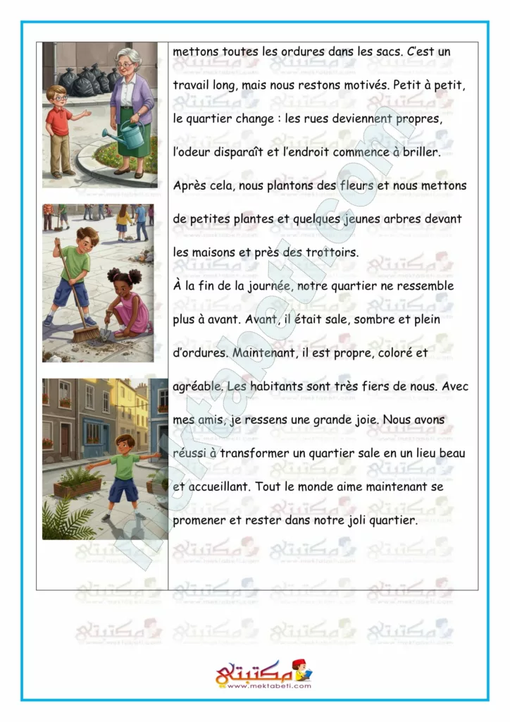 Après cela, nous plantons des fleurs et nous mettons de petites plantes et quelques jeunes arbres devant les maisons et près des trottoirs. À la fin de la journée, notre quartier ne ressemble plus à avant. Avant, il était sale, sombre et plein d’ordures. Maintenant, il est propre, coloré et agréable. Les habitants sont très fiers de nous. Avec mes amis, je ressens une grande joie. Nous avons réussi à transformer un quartier sale en un lieu beau et accueillant. Tout le monde aime maintenant se promener et rester dans notre joli quartier.