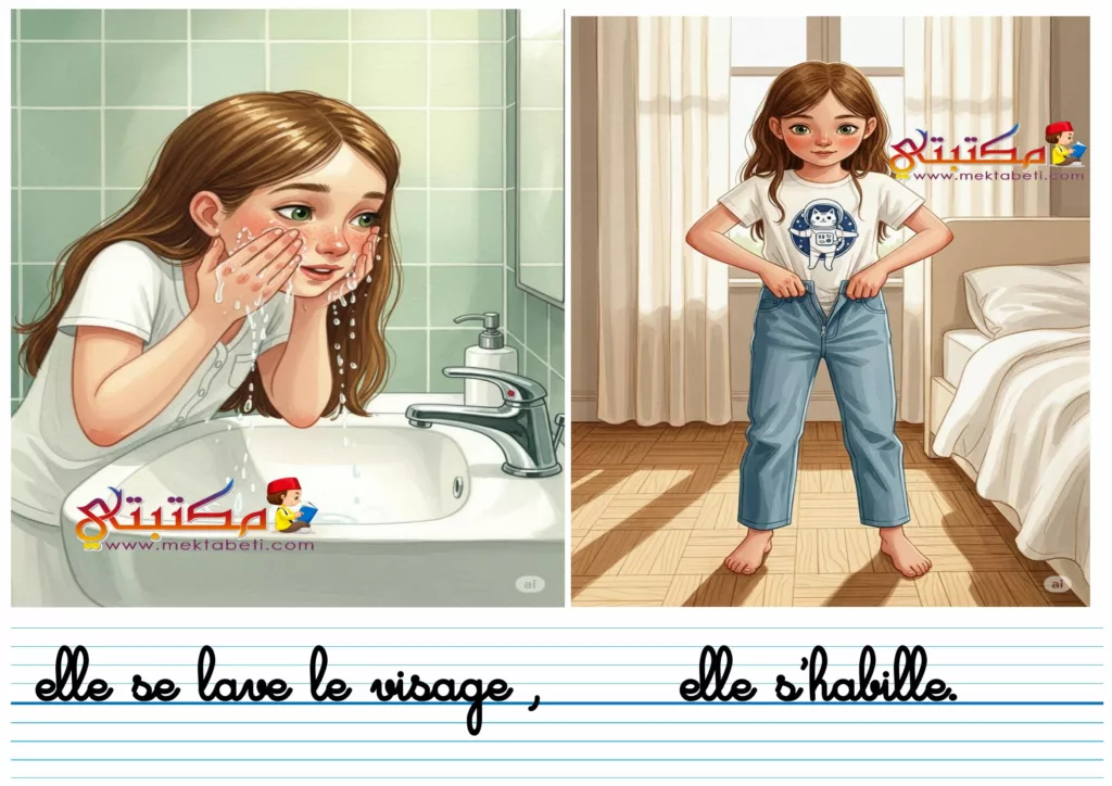 elle se lave le visage ,      elle s’habille.