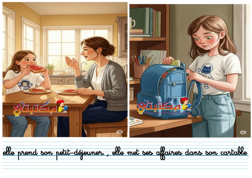 elle prend son petit-déjeuner. , elle met ses affaires dans son cartable