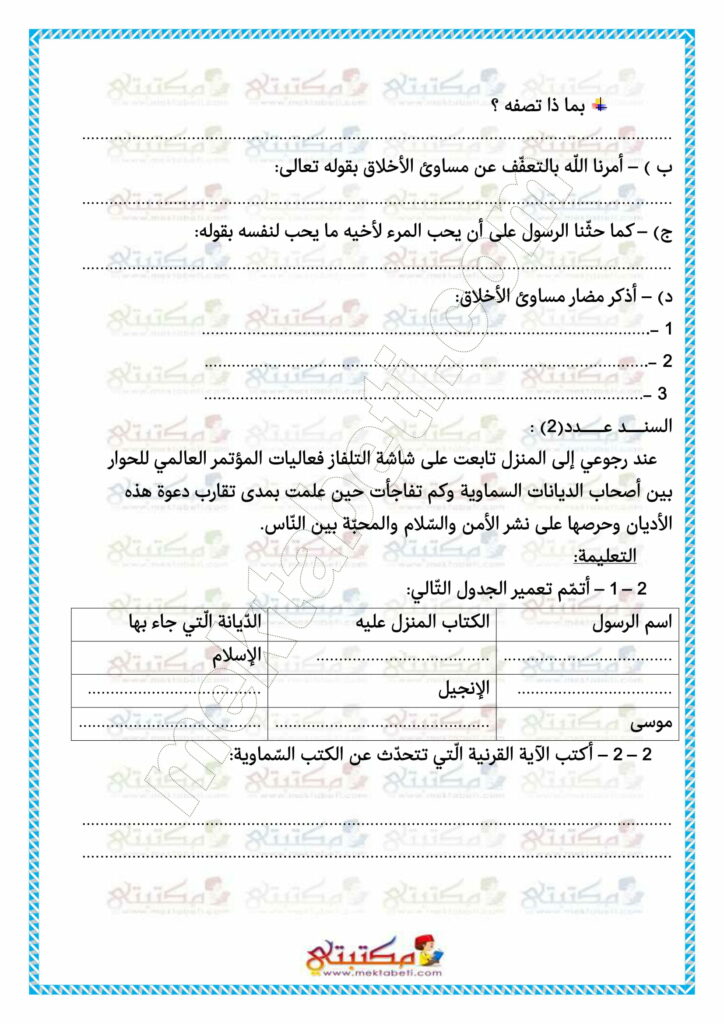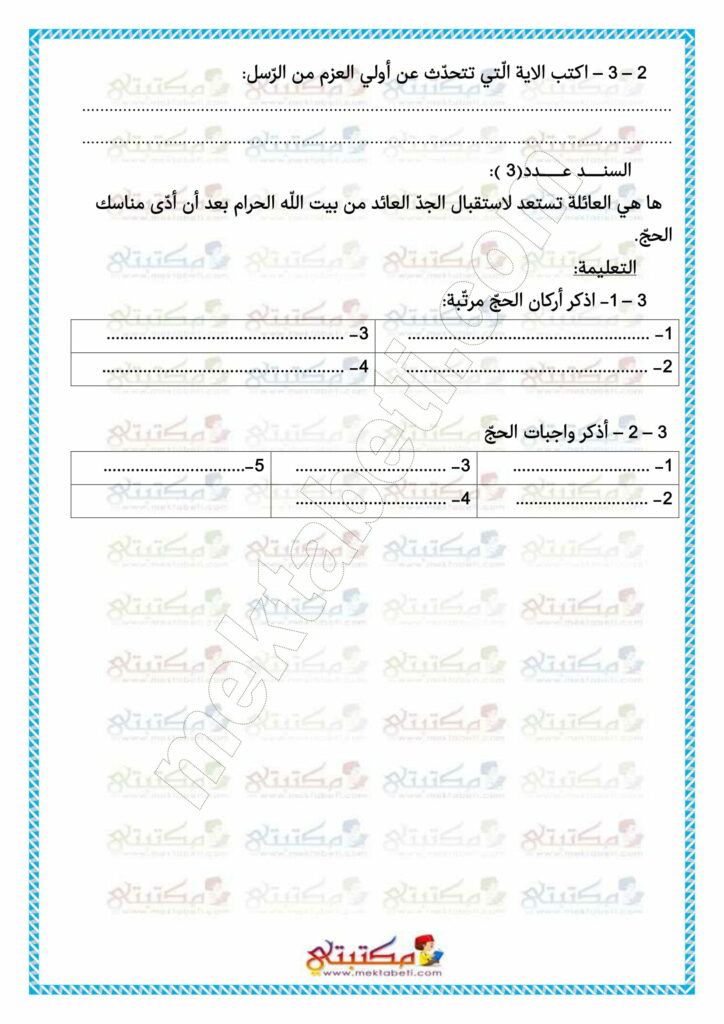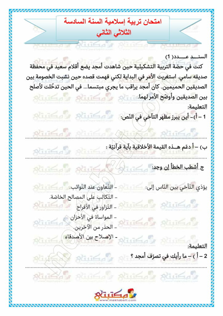 امتحان تربية إسلامية السنة السادسة الثلاثي الثاني